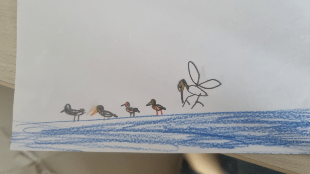 아이들은 이번 주말을 어떻게 기억할까? 일요일 밤늦게 애들을 재우면서 아내와 이야기했다. 서천에서 두 녀석이 뿜어내던 도파민을 떠올려 보면, 어떤 식으로든 우리 둘에게도 아이 둘에게도 잊지 못할 이틀임에는 틀림없어 보인다. 자세히 말해 주지는 않지만, 오늘 학교 가기 전에 자투리 시간에 도감을 찾아 그리다 만 이 그림이 대신 말해 주는 것 같다.
